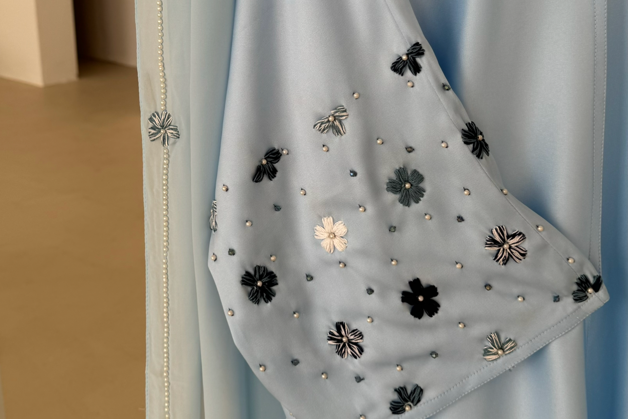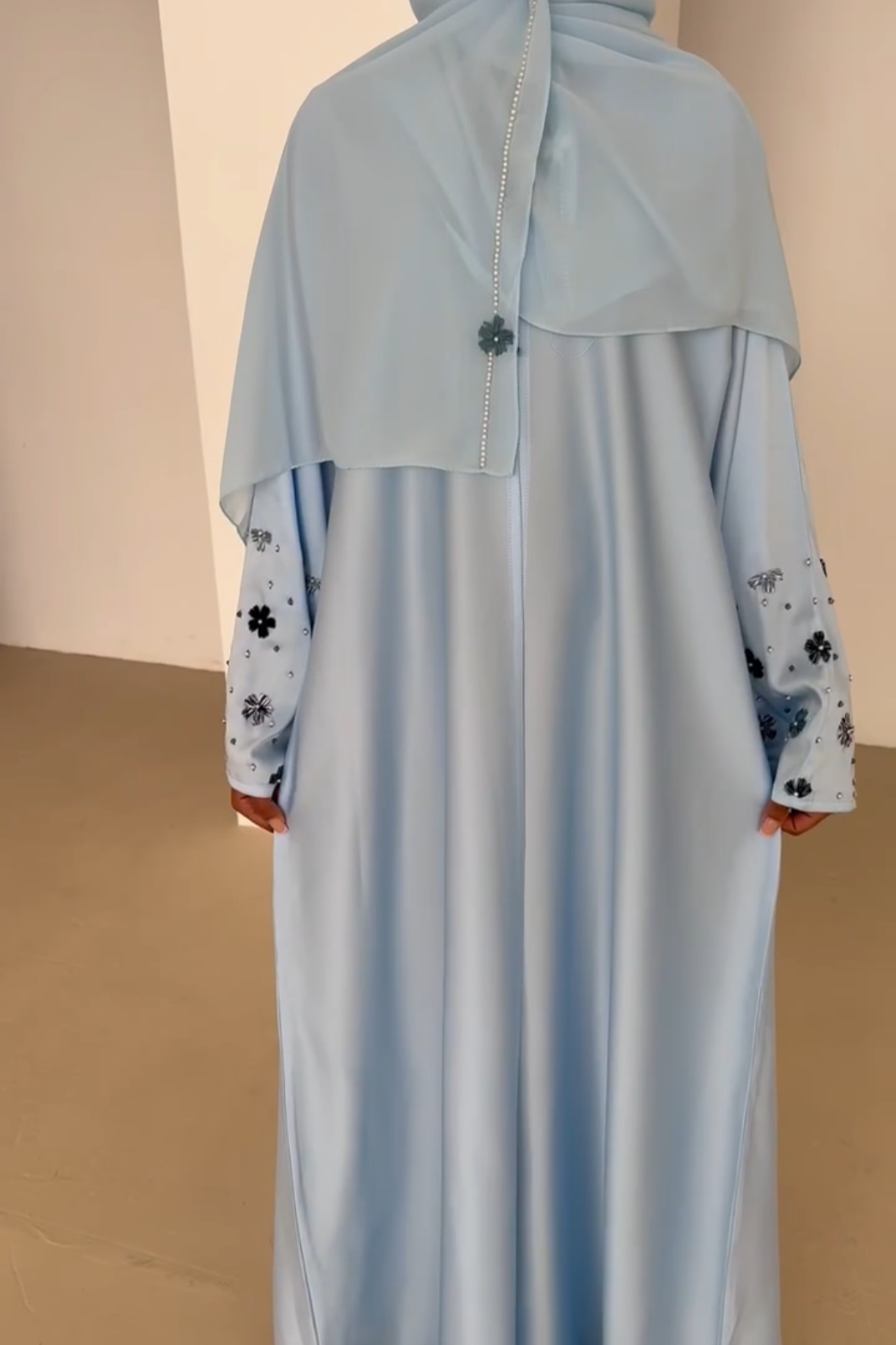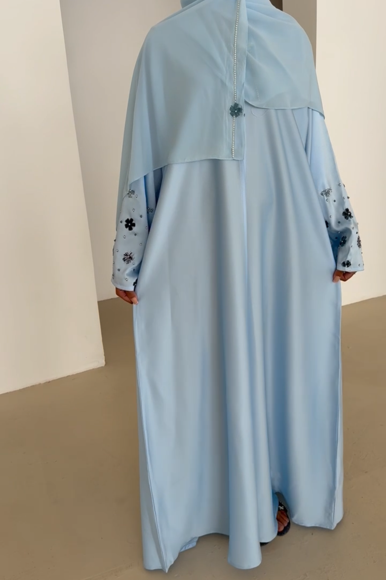 Elevate your modestwear collection with this serene light blue abaya, tailored from a silky, flowing fabric that offers comfort and sophistication. Featuring wide sleeves adorned with delicate white pearls and blue floral embroidery, this piece exudes understated elegance. The abaya comes with a matching chiffon scarf, lightly embellished to complete the look. Ideal for Eid, Ramadan gatherings, formal events, or everyday luxury. A timeless blend of grace and modern design.