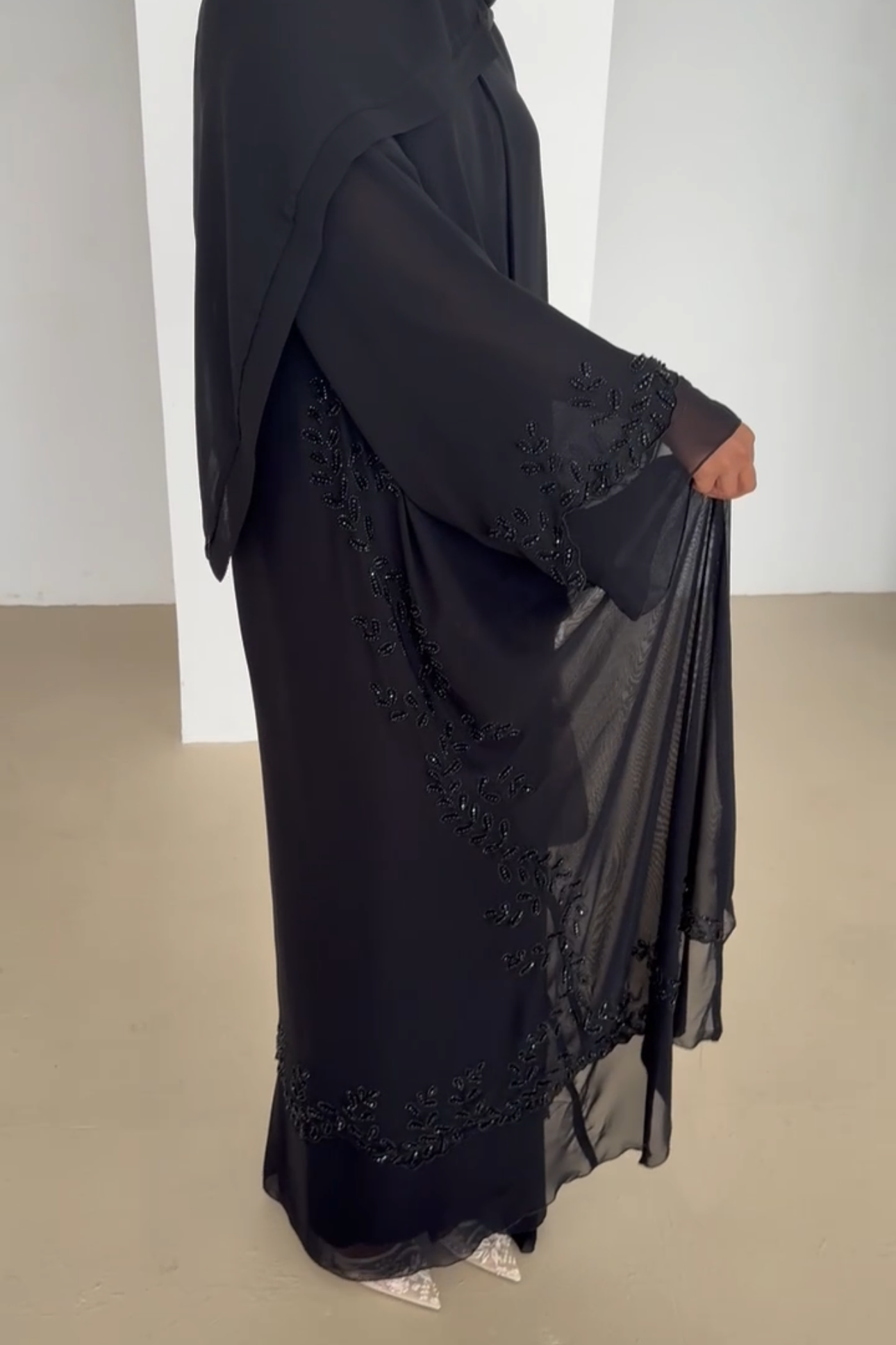 This beautifully crafted abaya is perfect for any Eid, featuring intricate hand beading along the sleeves and hem of the abaya. The detailing extends around the abaya, making it an eye catching twist to the 'simple black abaya'.
