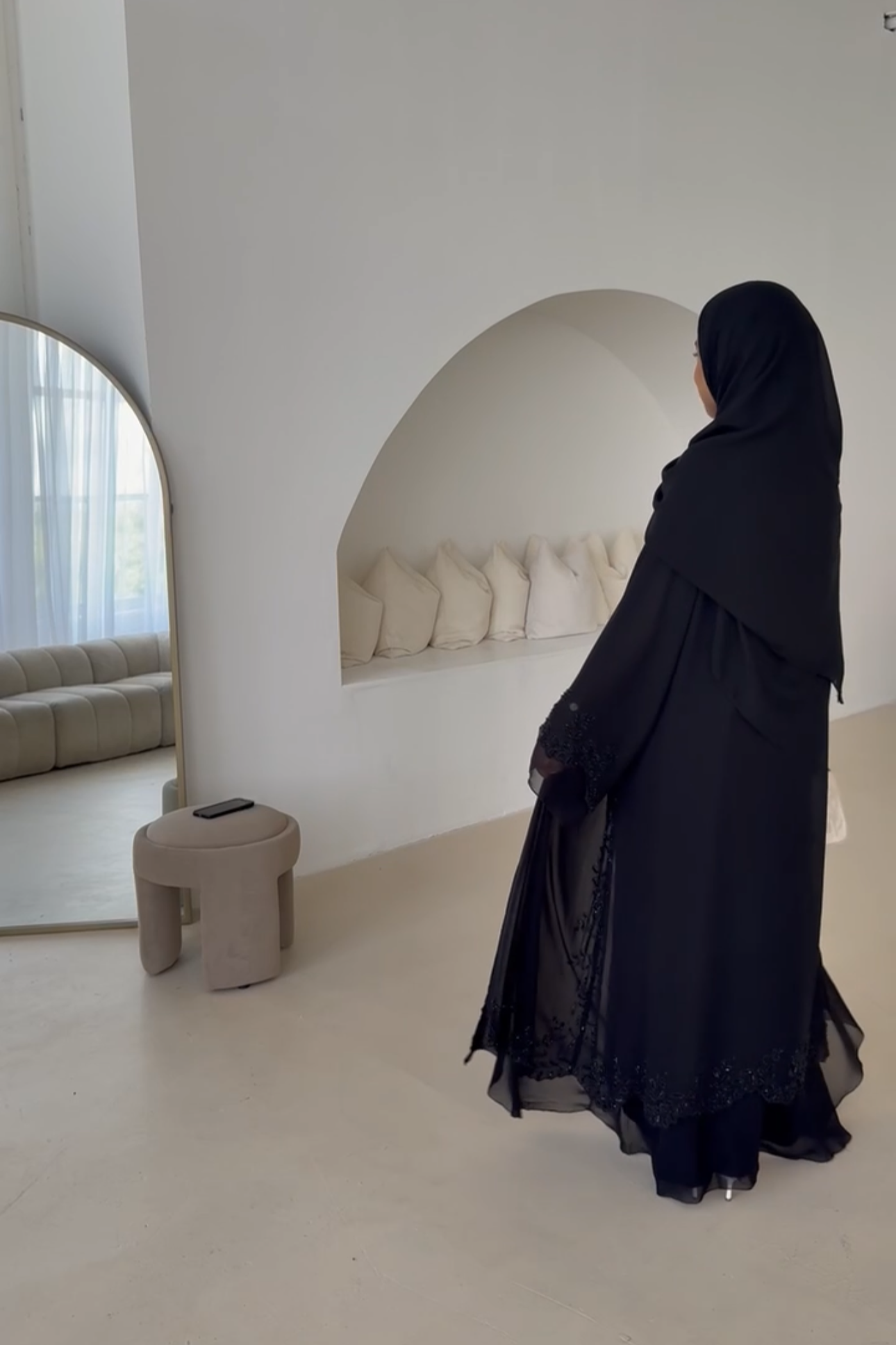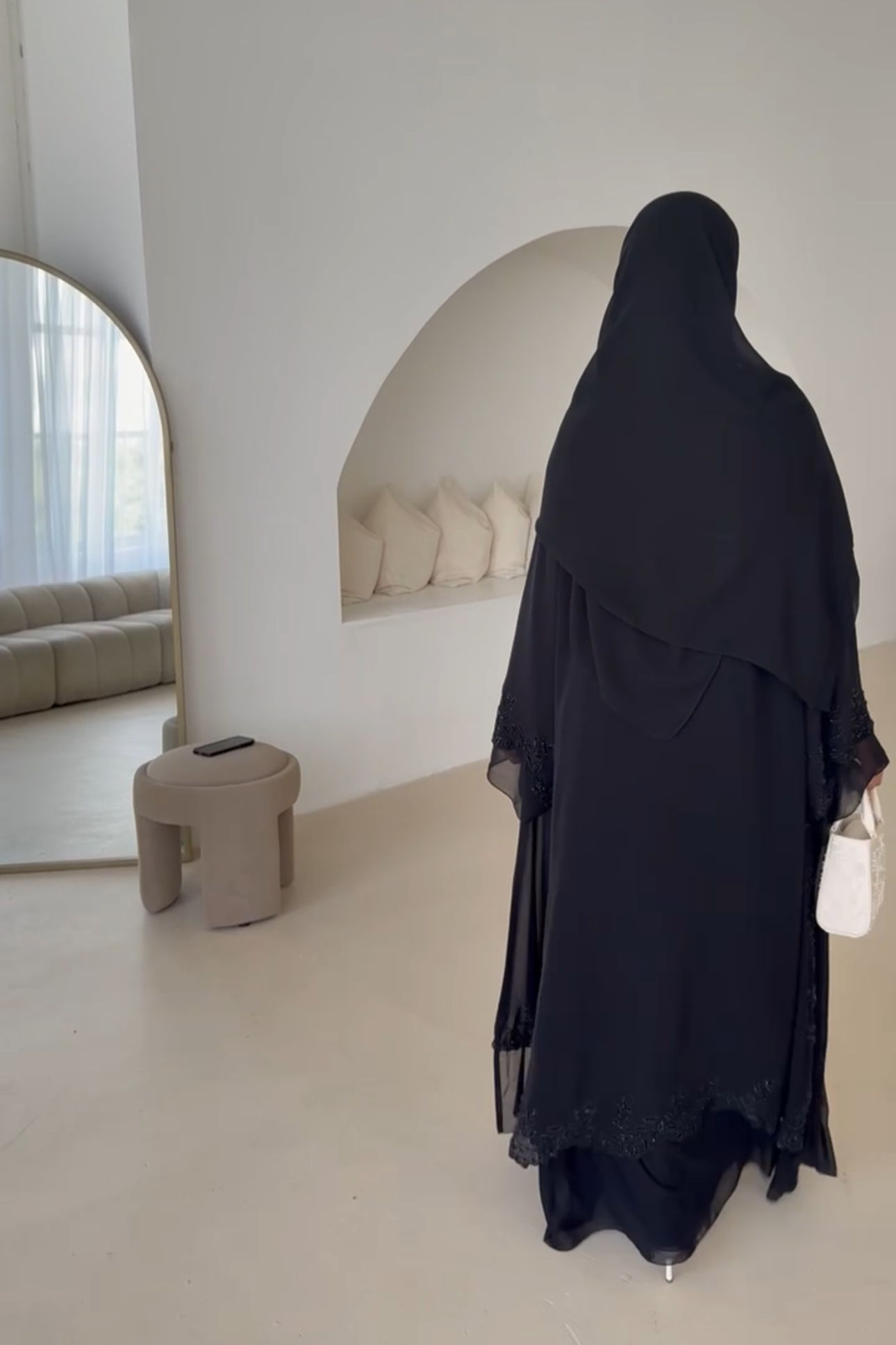 The abaya is made of 2 layers of lightweight chiffon, a staple for a mkwar cover up on Eid, or ontop of your outfit at a wedding.